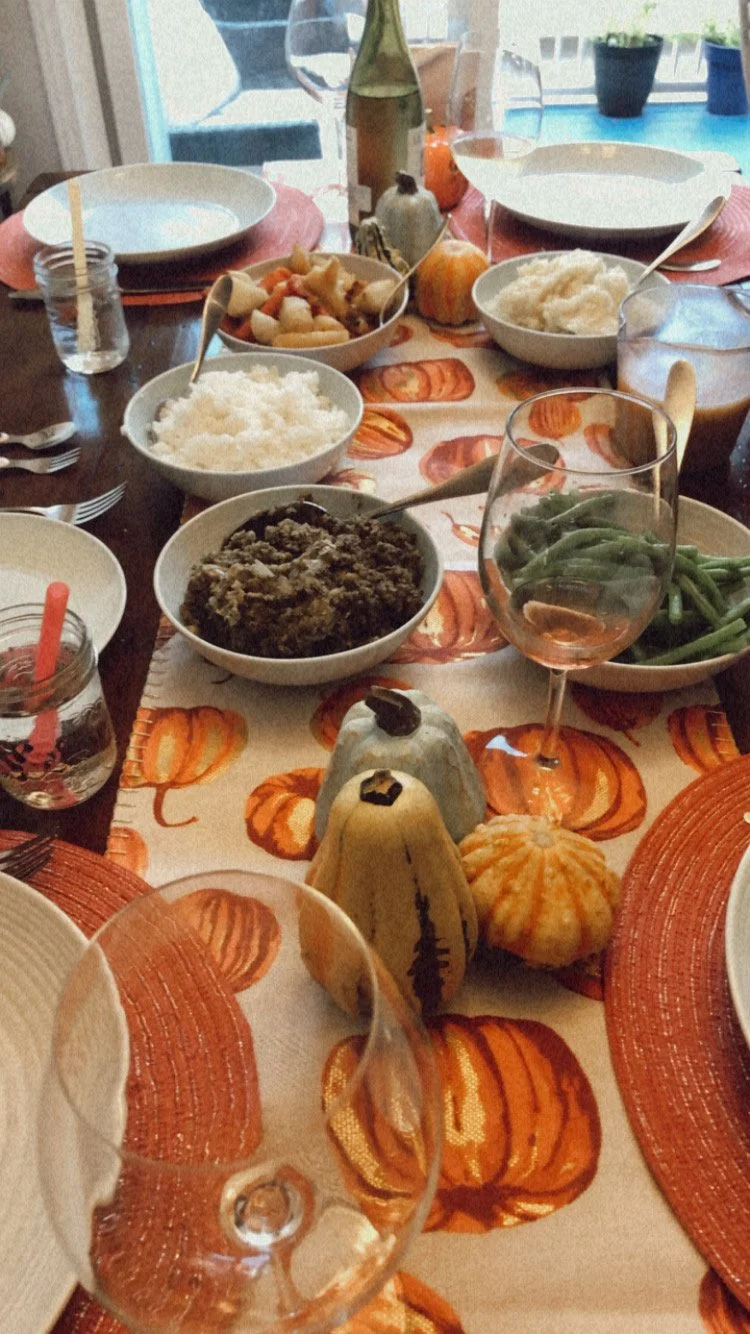 He’s a purist when it comes to the classics, so we always have creamy mashed potatoes made simply with butter, salt, and pepper, and a traditional herb stuffing that fills the house with that nostalgic Thanksgiving aroma. When my whole family joins us, we add rice on the side — a nod to my Colombian roots and the flavours I grew up with. I know, it’s a carb overload, but we love it!