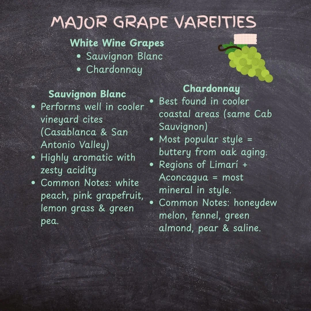 Once you know the lay of the land, you’ll start to notice certain grape varieties popping up on bottles. Let’s start with the whites grape varities. Chile has a knack for freshness.
